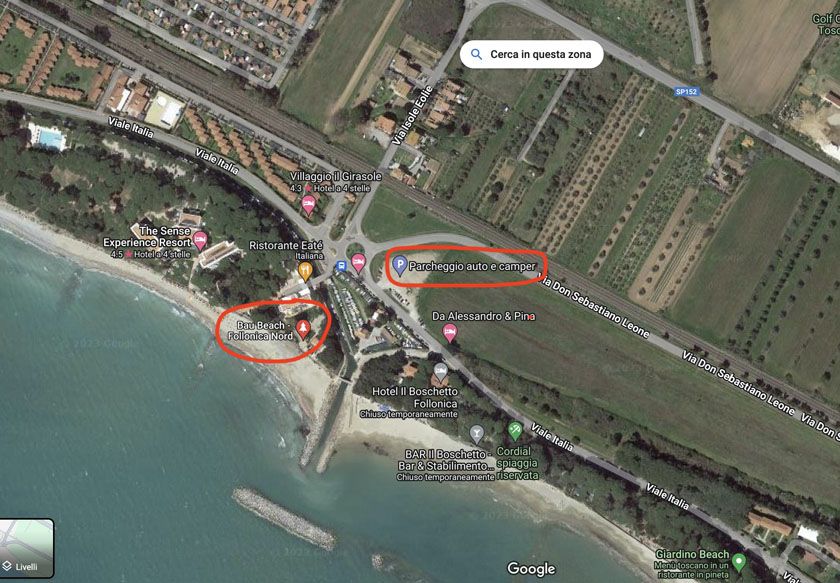 Einen Parkplatz weiter (auch gebührenpflichtig) über die Strasse und den Pinienwald gehend, kommen Sie, wenn Sie sich nach rechts halten, an den Strandabschnitt “Piastrone Beach Bar”. Hier werden Sonnenschirme und Sonnenliegen nach Bedarf einzeln vermietet. Links und rechts ist freier Strand. Die Bar ist für jeden frei zugänglich und es gibt auch eine Toilette. Hunde sind natürlich erlaubt.