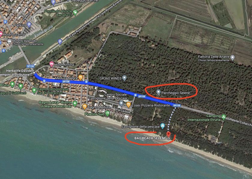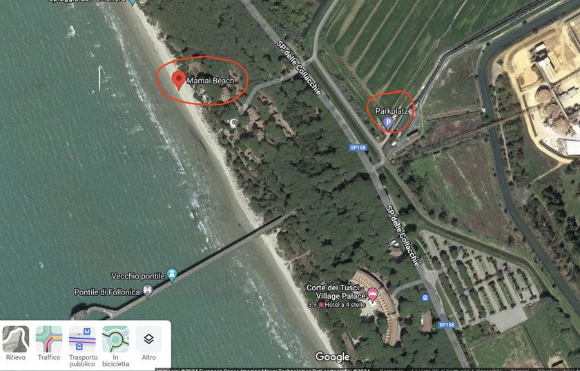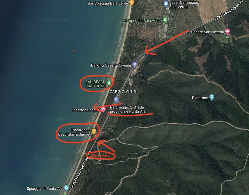 Der Hundestrand liegt entlang der Strasse Richtung Punta Ala, ca. 450 m nach dem Schild Casa Civinini. Sie fahren links in den Parkplatz (gebührenpflichtig). In der Hauptreisezeit ist der Parkplatz gut besucht. Von dort gehen Sie über den Zebrastreifen auf die andere Straßenseite. Dann führt ein kleiner schattiger Weg, durch das Pinienwäldchen in Richtung Strand.
