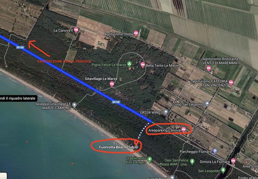 Der Hundestrand Fuorirotta befindet sich von Castiglione della Pescaia aus kommend in Richtung Marina di Grosseto (ca. 5 km) . Parken kann man auf dem Parkplatz “Area Parking Canova”. Überqueren Sie dann die Strasse und folgen Sie den Schildern zum Strand (ca. 10 Min. Fussmarsch). Der Hundestrand ist rechterhand. Hier gibt es eine Süßwasser-Dusche für die Vierbeiner (20-cent-Stücke nicht vergessen!) und es stehen Plastikeimer bereit, die gefüllt mit an den Strand genommen und jederzeit wieder aufgefüllt werden können. Auch an die Strandbar darf Hund mit. Schirme und Liegen können im Strandbad geliehen und mit an den Hundestrand genommen werden. Oder aber Sie bringen sich alles selbst mit.